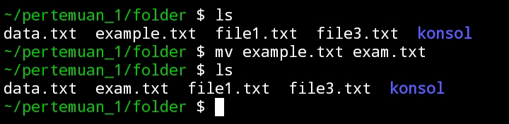 Disini kita memindahkan file  example.txt ke direktori folder menggunakan printah mv nama_file tujuan